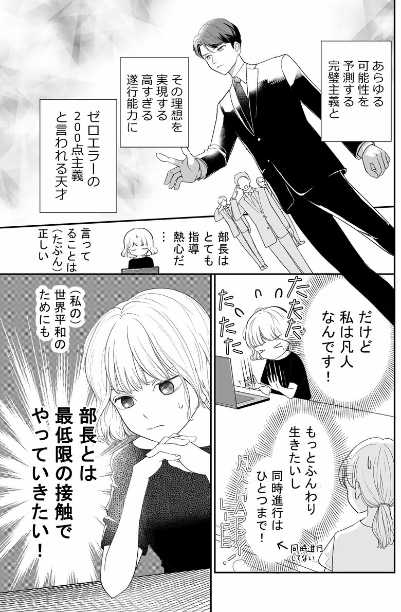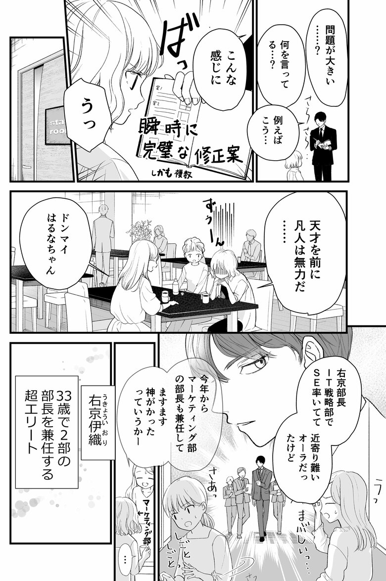 若手社員として働くはるなもまさにそんな状況。33歳ながら完璧すぎる部長・右京は「ゼロエラーの200点主義」と言われる天才。とても指導熱心だし、言っていることは(たぶん)正しい。