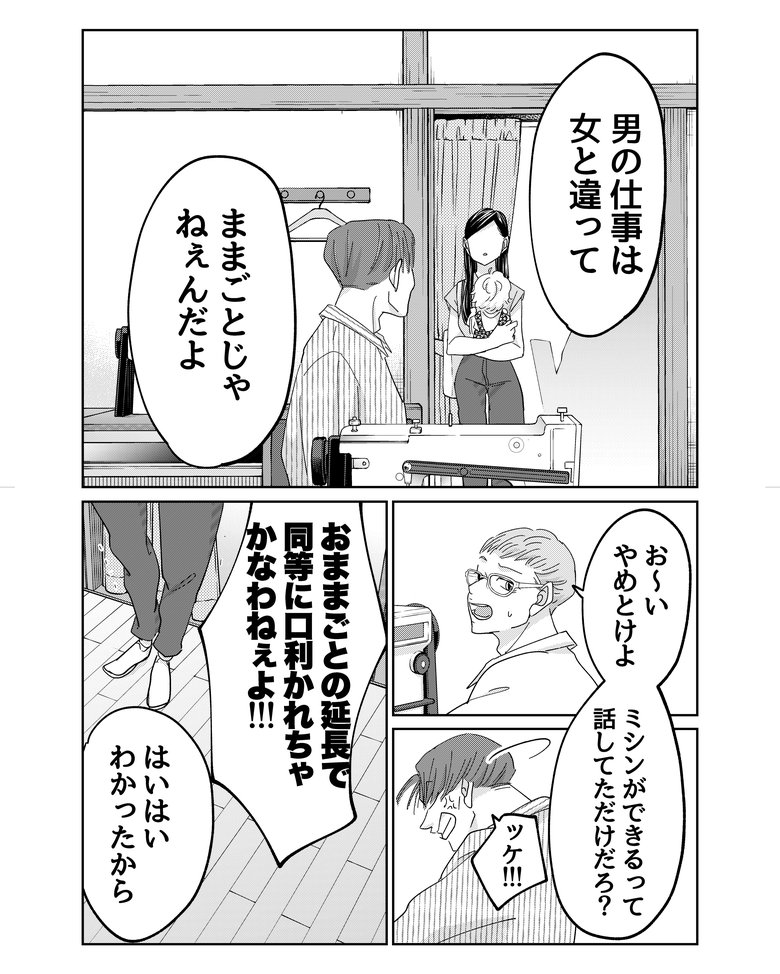 オーダーメイドシャツ専門店「DADDY Yシャツ」の工房で、ミシン仕事を手伝おうと申し出た鈴に対して職人からは「女性であること」「母であること」を理由に、強烈な言葉が投げかけられます。