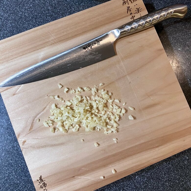 よく切れる包丁を使うのは楽しいですね。にんにく、しょうがは、自分史上いちばん細かいみじん切りができました!まな板に当たったときのトントンといういい音も料理に弾みをつけてくれて。これも料理がはかどるポイントですね。切れ味がいいので、切る食材がたくさんあってもラクに仕込みができました。