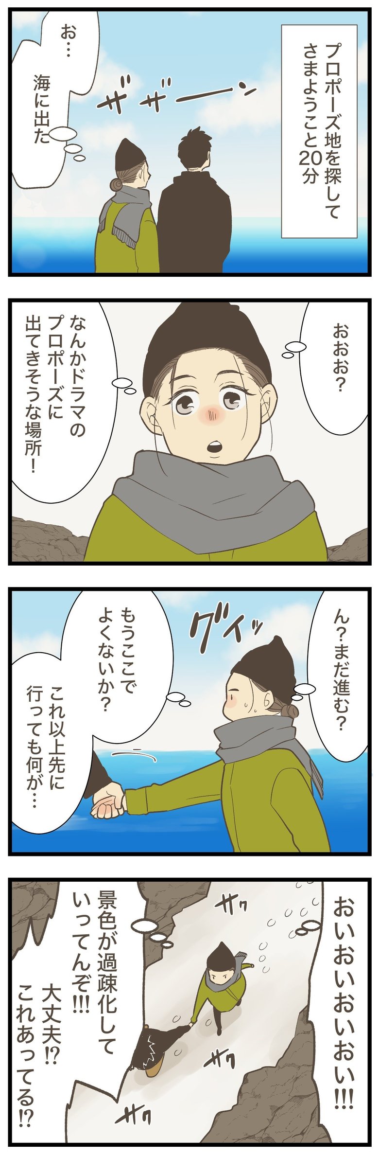 プロポーズの場所を探して歩くミロチさんと彼・チロくん。20分以上さまよってたどりついた海際は、ドラマのプロポーズに出てきそうないい感じの場所でした。しかし、そこには目もくれず岩場の方に進むチロくんに、ミロチさんは「景色が過疎化していってんぞ!大丈夫!?」と心配に。