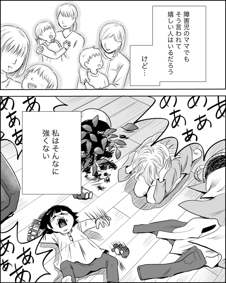 一方で、あやこさんは「障害児のママは強い」「尊敬する」「私には無理」など、周囲から投げかけられる言葉に思い悩んでいきます。