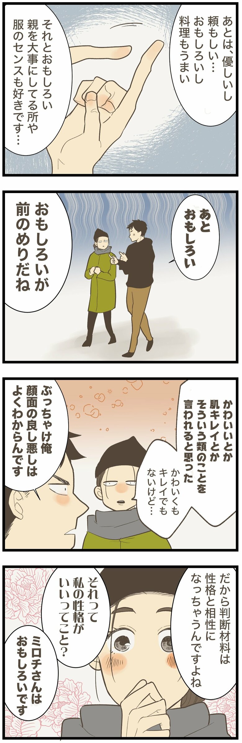 贈られた指輪を眺めてミロチさんは「婚約指輪オーラ、ビンビンでてるね」とプロポーズを実感します。そして、「チロくんってさ、私のどこが好きなの?」と聞いてみることに。
