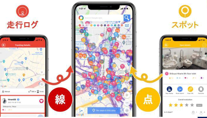 このアプリはいろんな人が見つけた街中のバリアフリー情報を集め、バリアフリーマップを作るのが特徴です。経験が価値になり、どんな人でも誰かの役に立つことができる。ふだんは助けられることが多い障害者であっても、他者に貢献できる世界を実現したい。車いすで実際に走行したルートや、ユーザー自身が実際に利用したスポットなどを共有しています。たとえば、駅や公共施設の車いす用トイレなどを撮影し、アプリにアップしてもらっているんです。すると場所はもちろん「ここのトイレは大きくて使いやすい」など、わかりやすくなります。このマップは障害者だけでなく、健常者の方にも協力してもらい、情報提供をお願いしています。