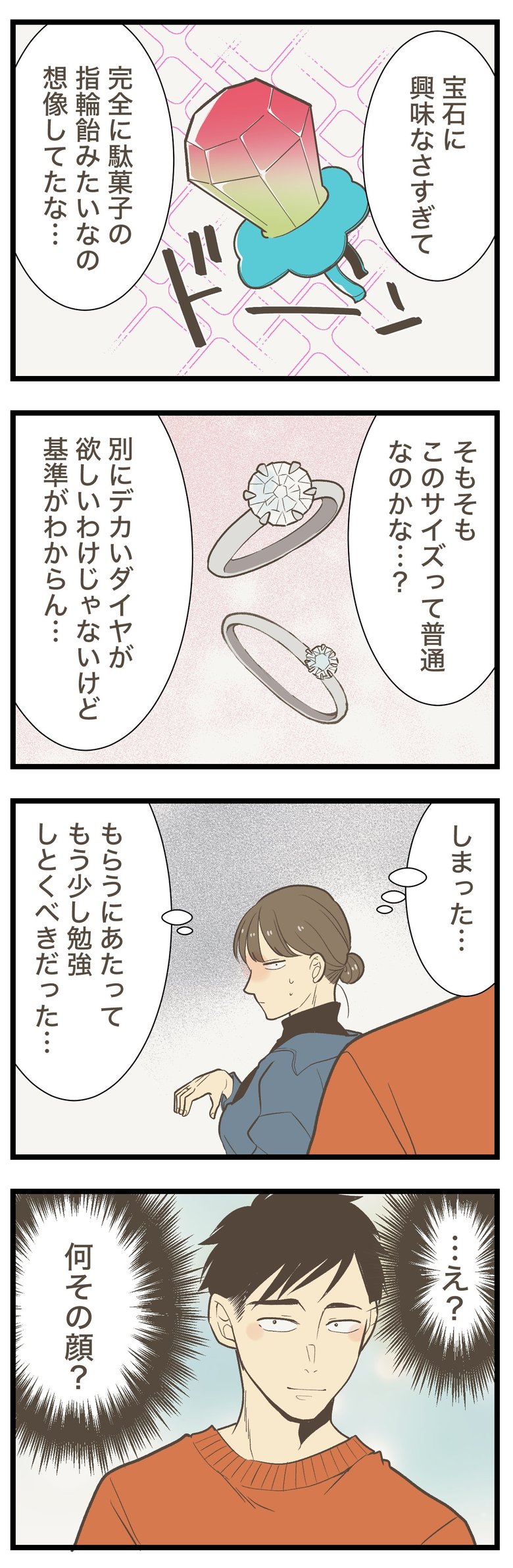 宝石に興味がなかったため、指輪選びはチロくんにおまかせしていましたが、もらった指輪を見ながらあれこれ思いを巡らせます。「ダイヤモンドってこんな感じなんだな」「このサイズって普通なのかな…」と考えていると、チロくんが意味ありげな顔でこちらを見ている…!