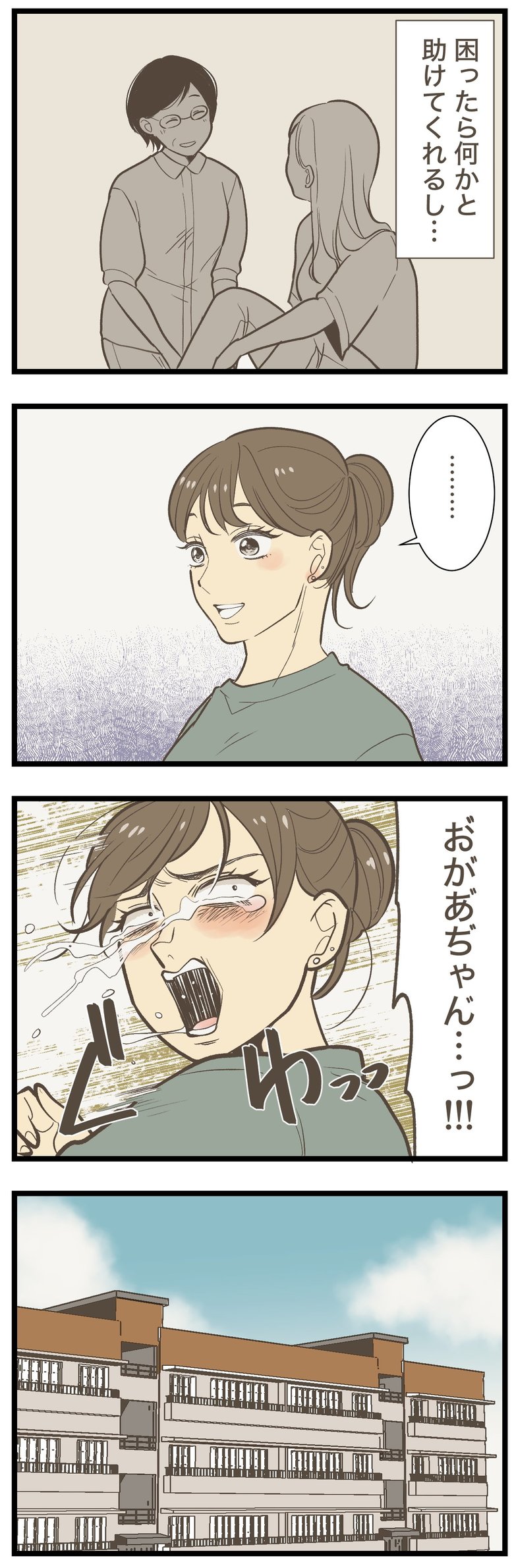 ひとり暮らしも気軽で好きだったけれど、実家にいたときは何もしなくてもご飯は出てくるし洗濯も終わっているし、何より困ったら母がそばにいてくれて…。そう考えていたら、母への思いがあふれて号泣してしまいました。