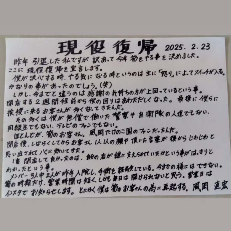 人気バラエティ番組『沸騰ワード10』で人気を得た風岡さんは、東京都内の芸能事務所に所属し、タレント活動をスタート。直売所は2024年夏に閉店、タケノコ農家引退を決断して臨んだわけですが、予想もしない事態が待ち受けていました。