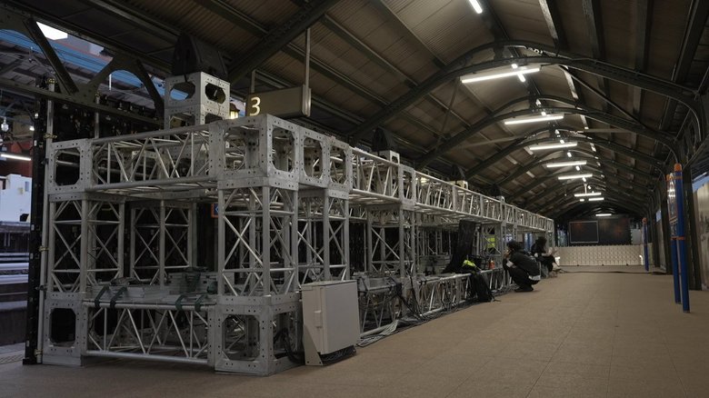 電通・アタリチーム:設置したLEDモニターは、横18メートル×縦2.5メートルという大きさで、これほど巨大なものを倒れないよう安全に設置するには、土台作りからしっかりした構造設計が必要でした。実際の設置作業は約12時間で終わりましたが、駅構内という特殊な場所のため、準備や安全チェックがかなり多く、普段のLED広告設営よりもずっと慎重な対応が求められた工程でした。