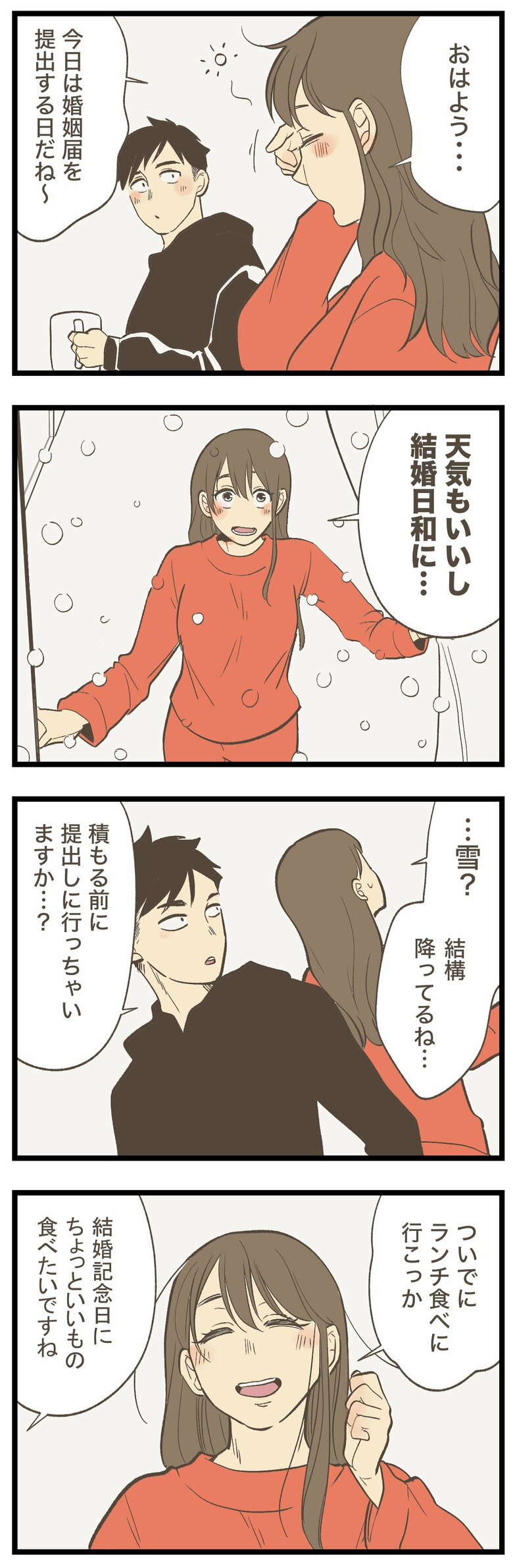 今日はいよいよ婚姻届を提出する日。しかし、天気はあいにくの雪…。ミロチさんはチロくんと相談して、雪が積もる前に提出し、記念のランチに行くことに決めました。