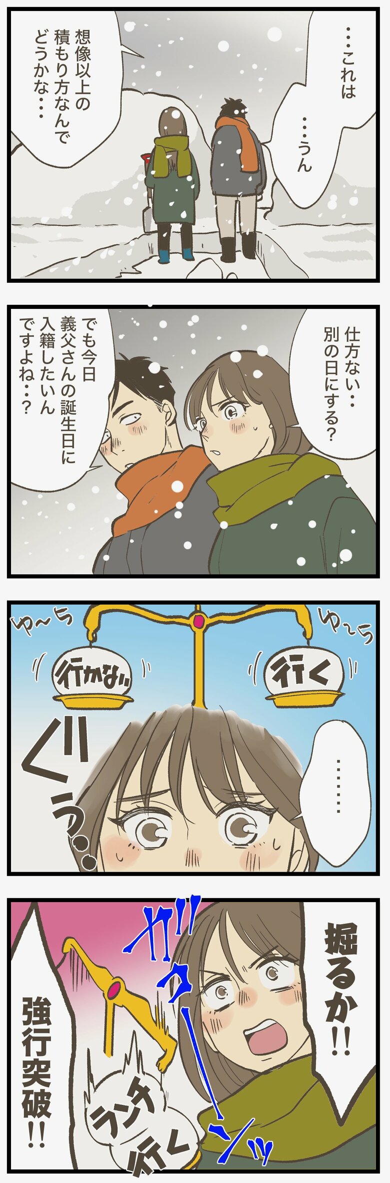 チロくんは、ミロチさんが父の誕生日に入籍したいと思っていることを知っているため、「でも今日入籍したいんですよね?」と気遣い尋ねてくれます。その言葉にミロチさんは、結果、雪を掘り強行突破することにしたのでした。