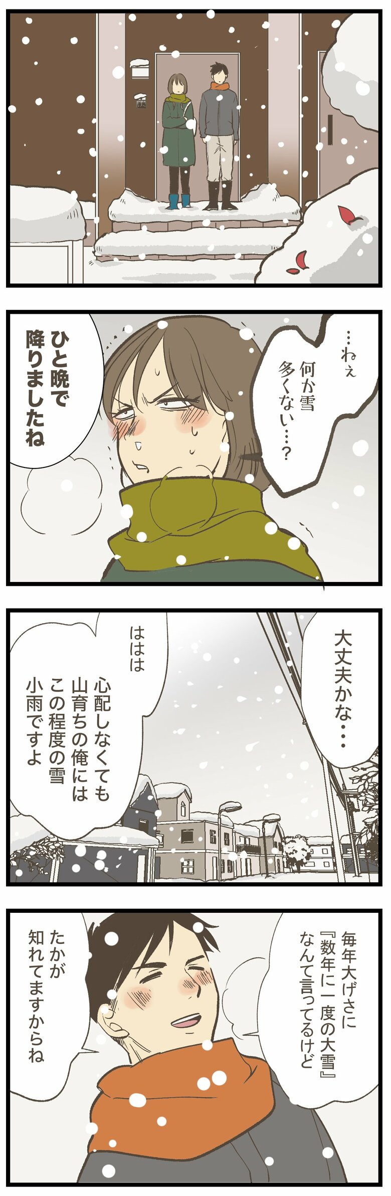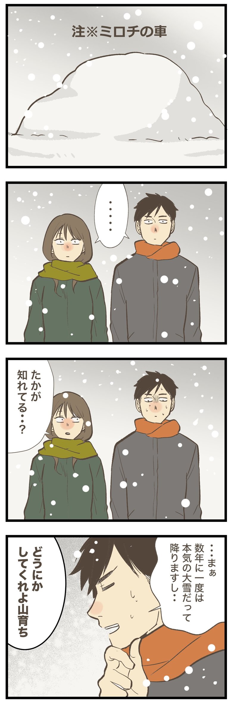 でも車は雪にすでに埋もれていて…、強気だったチロくんも「まあ…数年に一度は本気の大雪も降りますし…」と言い訳。ミロチさんは「どうにかしてくれよ山育ち」とツッコミを入れながらも、別の日にしようかと切り出します。