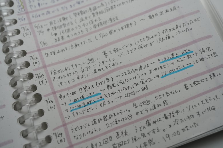 また、がんの治療にあたって知人からアドバイスをもらう機会がたくさんあったんです。みなさんよかれと思って教えてくださるんですが、闘病中はそのアドバイスを聞くのがつらいこともあって。たとえば「私の親族は抗がん剤治療をしなくても再発しなかったから、抗がん剤治療は無理してしなくてもいいのでは」と言われて、自分の選択が間違っているのだろうかと感じたりしたんです。そんなときは、気持ちを書き出してそのつらさを整理していました。ワンクッション置くことで、相手が自分のことを思って教えてくれているんだと素直に感謝できるようにもなりました。