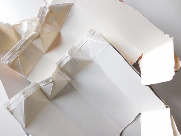 でき上った三角柱の材料を、5本組み合わせた台形を2つと、7本組み合わせた台形を2つ作ります。それぞれテープでぐるぐる巻きにして固定します。これで24本の6角柱が大きさの違う2種類の台形のパーツ2つずつになりました。この台形を組み合わせて六角柱を作りぐるぐる巻きにして固定すれば、六角柱の椅子の完成です。 いきなり24本で六角柱にしてしまうことも可能なのですが、その場合外面の3角柱だけが固定されてしまい、内側にくる3角柱は固定されなくなります。すべてを固定させるために台形のパーツ4つに分けて固定するのです。 これだけだと座る面がデコボコしてしまいますから、上面の六角形に合わせて切った段ボールを乗せればとらえず完成ということになります。段ボールがずれてしまう場合は、両面テープなどで固定するとよいでしょう。