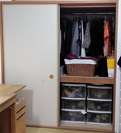 【 服をたたむ時間が節約できる 】 引き出しを使うのは、長男と次男だけ。 子供の服はたたんで収納しますが、ママの服はすべてハンガーにかけたまま納めます。 靴下や下着などは、しわになっても構わないので、かごに投げ込んでいます。 長男が中学生になって制服を着るようになったら、パパと同じような管理方法にシフトする予定です。