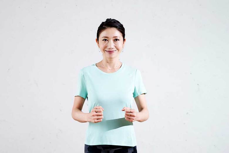 「まず、腕をしっかりと振ることを意識して行ってみましょう。両脇は拳1個分あけて、ハの字になってるようなイメージを持ってください。疲れてくるとどんどん肩の力が入ってきがちですが、脇を開けておくことで肩をすとんと落とす体制をキープできます。その状態で、腕をしっかりと振るイメージで走りましょう」