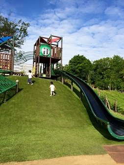 遊びの広場はお砂場や遊具もあり子供たちに大人気のスポットです。芝生に覆われた丘を裸足で駆け上がり広々とした公園を走り回ります。