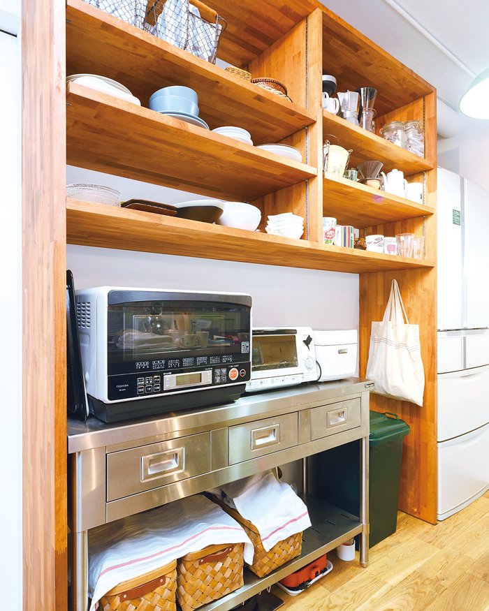 憧れのカフェを見本に作ったキッチンは、見せる収納に。上段のオープン棚にはよく使う食器やお茶セットを。下段は箸などこまごましているものを棚に入れて使いやすく。