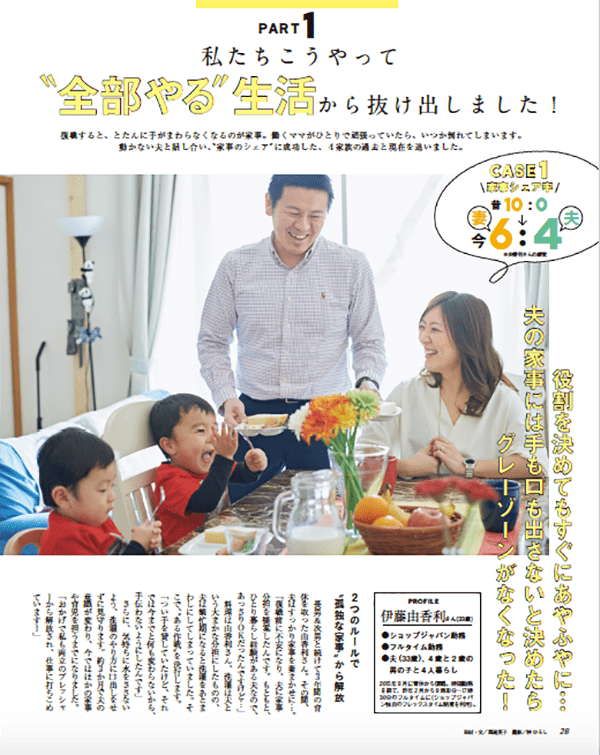 復職すると、とたんに手がまわらなくなるのが家事。働くママがひとりで頑張っていたら、いつか倒れてしまいます。動かない夫と話し合い、"家事のシェア"に成功した、4家族の過去と現在を追いました。どうやって今の家事シェアの割合にたどり着いたのか、ステップを追って解説し、夫と妻の平日&休日のシェア時間割も大公開。どんなふうにシェアしているのか、ぜひ参考にしてください!詳しくはCHANTO5月号をご覧ください。