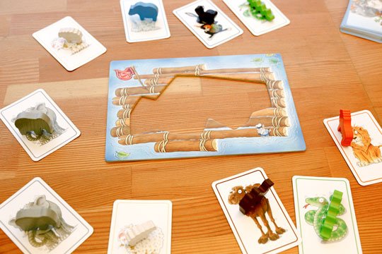 いかだタイルは穴の形やサイズが6種類あるので、1枚選び中央に置きます。動物カードは、ゾウ、ヘビ、カバ、ヒツジ、ライオンなど10種類、各3枚ずつあります。それぞれの動物の形をしたかわいらしいコマも3個ずつあります。全部で6ラウンド行います。