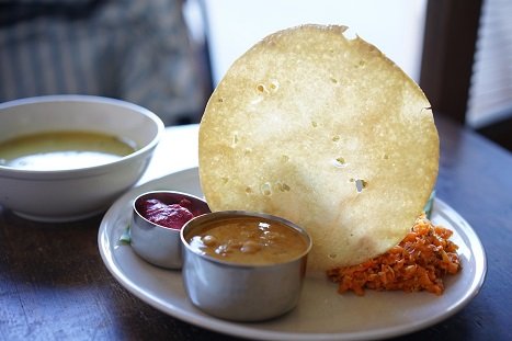 逗子海岸から徒歩5分、ヴィーガンカフェ、ビーチマフィンにてインドカレーのミールス(南インドの定食)が振る舞われました。日本で、アーユルベーダの技術と知識を提供しているMOKSHAのサジンさん、ラクシュミ・ヤスコさんの二人が作る、野菜が満載のインドカレー。動物由来の成分が入っていないので、秋の体と心に合う優しいカレーになっています。まずはさつまいものスープ。甘さとスパイスがよく合います。続いてメインのひよこ豆のケララカレー、ケララ地方はアーユルベーダ発祥の地です。にんじんのサブジ(細かく刻んだサラダのようなもの)赤カブのチャツネ、スパイスライス、パパド(豆のおせんべい)で、ミールスが完成。「すべて混ぜて召し上がってください」とヤスコさん。温かいカレーも、冷たいサブジも、パリパリのパパドもすべて混ぜるのがインド流。口の中で、温かい、冷たい、ホロホロ、シャキシャキ、スパイスとまろやかな野菜の味が渾然一体となります。大人気なのも納得がいく味でした。今流行っているミールス、皆さんも今週末、南インドカレー屋さんに出かけてみてはいかがでしょうか?