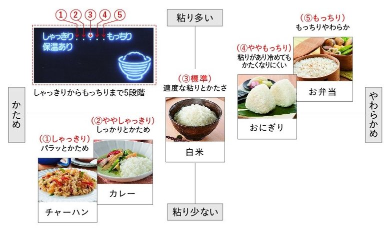 お好みに合わせた「炊きわけ機能」も搭載。炊きあがりの「粘り加減」が、「しゃっきり」から「もっちり」まで5段階で選択可能です。
