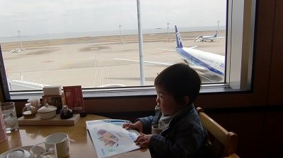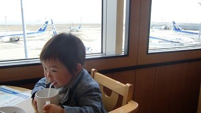 広い窓から飛行機を眺めながら、いつもは食べムラのある息子も、もくもくと食べてくれました。