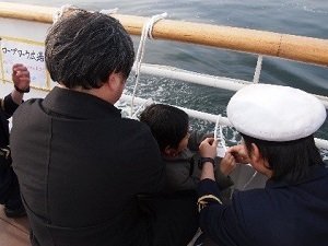 いよいよ乗船、12:00ジャストに出航です。出航セレモニーでは、銅鑼を鳴らします。今回は、一般乗客の代表の方が鳴らして、出航となりました。(その後、希望者も銅鑼を鳴らす体験ができました。)