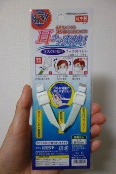 そんな悩みを抱えつつ、何気なく100円ショップに出掛けた時に「これこれ!」とベストな商品を見つけたので、迷わず家族分購入。それが、「耳ウラ爽快!マスクひも用 フック付きベルト」です。