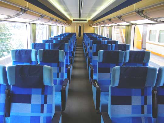 「デラックスカー」「サロンカー」以外の車両は「レギュラーカー」です。「レギュラーカー」は2列+2列となっており、一般の特急列車と変わりません。シートの色が華やかなせいか、他の近鉄特急よりも賑やかな感じはしますね。