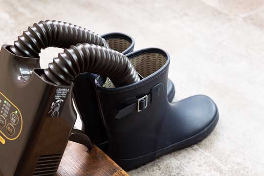また、脱臭くつ乾燥機カラリエはシューズボックス内の乾燥や脱臭にも使えます。温度が上がりすぎると安全装置が働いて30秒間冷却運転をしたあとに停止するんです。これなら外出中にセットしておくだけで湿気やニオイを除去できますね。
