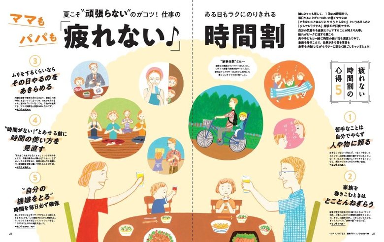 誰にとっても等しく、1 日は24時間きり。毎日やることがいっぱいの働くママには「できないことはムリにやろうとしない」というあきらめと「少しでもラクする」探求心が肝要ですが、自分の気持ちを家族とシェアすることが何より大事。疲れがピークに達する夏こそ、夫や子どもと一緒に時間の使い方を見直してみて。