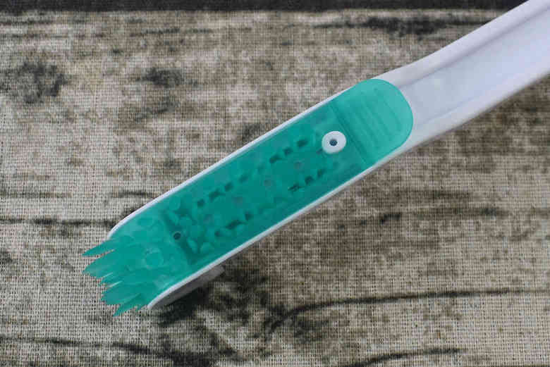 早速パッケージを開けて、ブラシの形状からチェック。全長約24センチほどの同商品は、先端に緑色のブラシがセットされています。試しに触れてみたところ、思っていた以上にチクッとした材質でした。たわしのような毛並みではなく、プラスチックに近い少し硬めの触り心地です。持つ部分は手にしっかりフィットするので、力が入りやすく洗浄力にも期待ができそう。