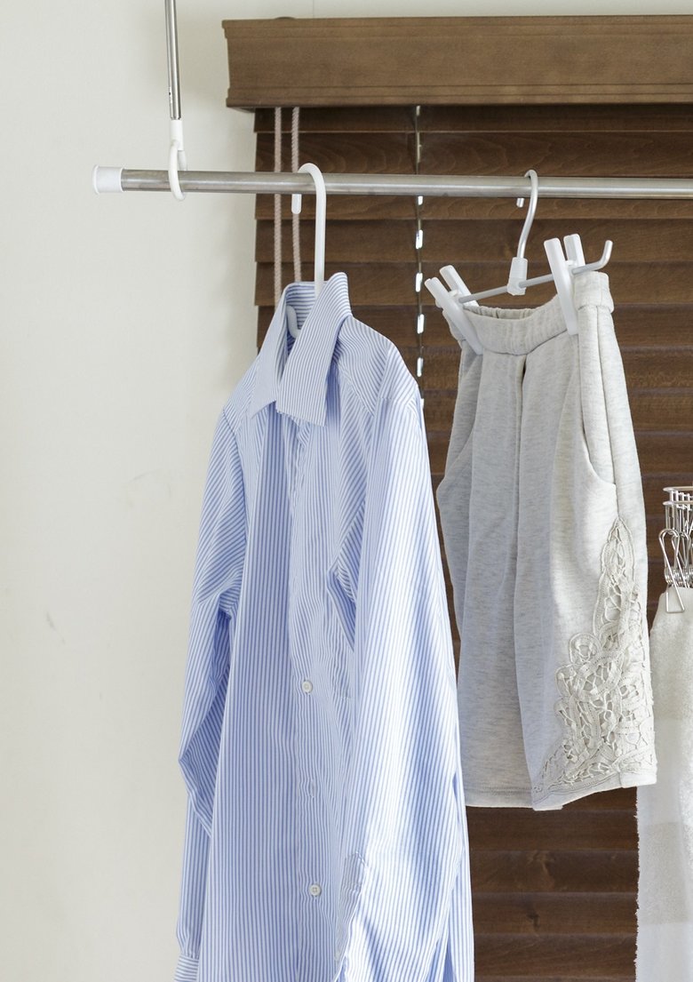 湿気は部屋の下へたまるため、少しでも湿度の低い上部に干すほうが、乾きが早くなります。ポールや壁に取りつけられる洗濯ひもなどを上手に使って、高い場所へ干しましょう。