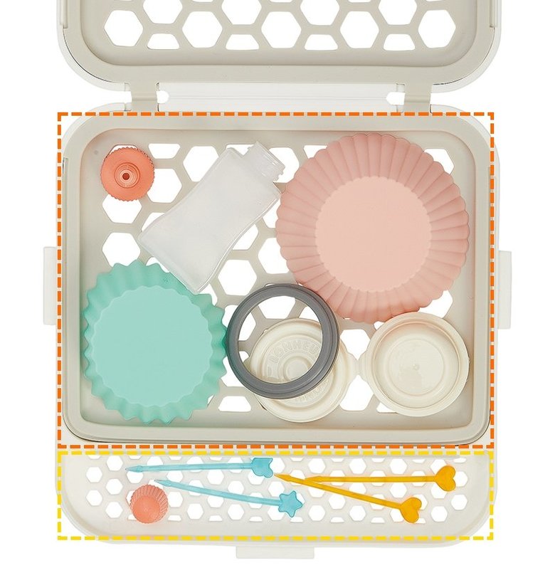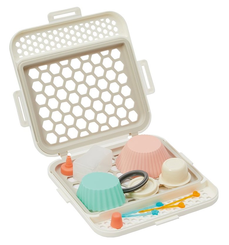 また本体の一部がシリコーンゴム製ネットになっており、ネットが伸びてぴったりフィット。食器の片寄りを防止するため、まとまりすぎて“すすぎが不十分”などの心配も無用です。さらに本体には、大小あるおかずカップなどを分けられる仕切りつき。色々なサイズをまとめて洗えるので、食洗器に入れられない小物を分けて手洗いする手間を減らしてくれます。