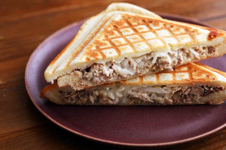 こちらのレシピでは、レコルトの「プレスサンドメーカー キルト」を使用。焼き時間は2分半〜3分です。焼き時間は各家庭でお使いになるホットサンドメーカーやパンの厚みによっても多少変わります。なお、焼き立ては熱々なので、小さいお子さんには少し冷ましてからあげてください。