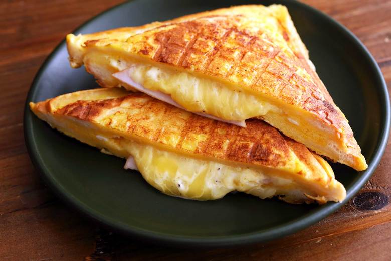 ハムとチーズの組み合わせは定番中の定番ですが、こちらはひと手間かけてフランス発の「クロック・ムッシュ」風に仕上げたレシピ。パンは、表面はカリッと中は卵液が浸みてふわふわの食感が楽しめます。その間からチーズがとろ〜っと出てくると、まるでホテルの朝食のようなリッチな気分に。
