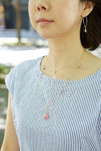 さわやかなストライプのワンピースは、ネックレスの重ねづけで目線をアップ。キャンディのようなピンクのビーズネックレスは、なんとハンドメイドなのだとか。ひと粒ダイヤのネックレスとの重ねづけにすることで、大人の遊び心が光ります。(38歳、大学勤務、5歳の男の子のママ)