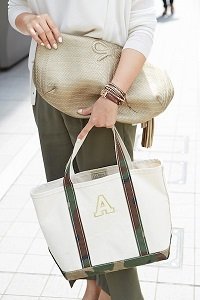 L.L.Beansのキャンバストートは、迷彩柄はアースカラーのコーデによくマッチ。ポケット部分に、イニシャルなどの刺しゅうを入れるのが、おしゃれさんのスタンダードです。ゴールドのメッシュバッグは、バッグinバッグにすれば、トートバッグの中を仕切る役目もしてくれます。(30歳、会社員、1歳の男の子のママ)