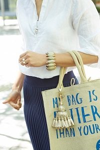 半そでやノースリーブの季節、腕まわりのおしゃれも楽しみがいがあるというもの。オーストラリアで購入した大ぶりの貝がらブレスレットで、存在感を出しました。オーストラリアのスーパーの麻素材のエコバッグには「アニヤハインドマーチ」のタッセルキーホルダーをつけて、エコバッグがグンと格上げ!(38歳、パーソナルスタイリスト、8歳の男の子のママ)