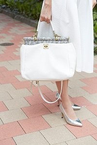 清潔感のある白い2WAYバッグは「マイケル・コース」。かちっとしたフォルムとレザー素材で、きちんと感を演出してくれます。子どもが急にぐずったり、抱っこしなくちゃいけないときも、斜め掛けできればイライラしないですみそう。(33歳、会社受付、6歳の男の子のママ)