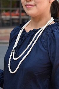 ネイビーのチュニックに、さらりと合わせたのは「アーバンリサーチドアーズ」で購入したパールのロングネックレス。2連巻にすることでゴージャス感がでます。カジュアルなコーデに合わても、ほどよくきちんと感が出るのが、パールの底力です。(39歳、会社員、6歳の女の子のママ)