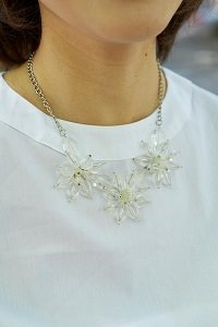 大ぶりの花モチーフのネックレスも、クリア素材ならほどよく存在感控えめで、オフィスでも浮かないはず。シンプルな白いブラウスとも好相性で、夏らしい涼しげなコーデに仕上がります。クリア素材に日がさして、顔まわりがパっと明るくなる効果も。(35歳、サロン主宰、6歳の男の子と4歳のふたごの女の子のママ)