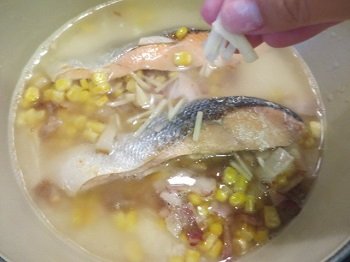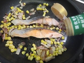 材料は生鮭、ベーコン、冷凍コーン。大人用であれば塩鮭で作るとおいしいのですが、小さなお子様には塩っ気の少ない生鮭がおすすめ!ベーコンは一口サイズに切っておきます。フライパンにバター10gを入れたら、材料全てをさっと炒めます。うっすら鮭に焼き目がついたら醤油をたらりと垂らして火を止めます。