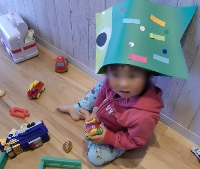 カットのあいだも、「人数が増えてきましたが、みんなで仲良く遊んでいるようですよ〜」と、別室のキッズスペースの様子を、スタッフの方が伝えてくれました。筆者が利用した日はこどもの日が近いこともあり、こいのぼりを作っていたようです。息子のたのしげな様子をきき、「帰りたがらなくなるのでは……」なんて不安になってきたところで、カットは終了。一時間ほどでした。いざ、お迎え。こいのぼり、かぶってた(笑)