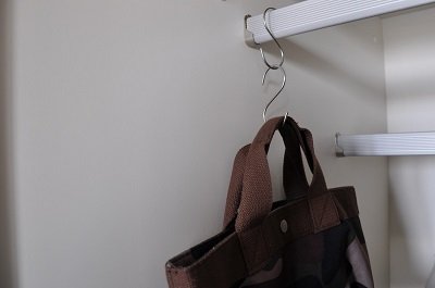 バッグは案外かさばるので収納場所が悩ましいですよね。そこで私はバッグも服と一緒にクローゼットのバーにかけちゃってます!S字フックひとつにかけるだけだと幅をとるので、ふたつ使って画像のようにかけています。