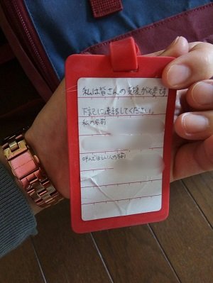 では、ヘルプマークはどのように手に入れることができるのでしょうか?書類等の提出の必要はなく、本人ではなく、家族・親族がかわりに受け取ることも可能です。基準もなく、誰でも希望すれば受け取ることができます。緊急連絡先を記載できるステッカーも、同時にもらえますよ。このように、裏面に貼ることができます。