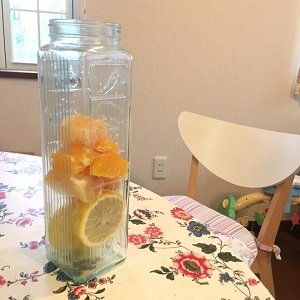 見た目にも涼しげなガラスの容器を用意して、材料をつめていきます。ピッチャーが無かったので、パスタ瓶を使ってみました。中に入れるフルーツは、切り口が見えるように入れると見た目もキレイに仕上がります。ちなみに、国産レモンは皮付きのまま、オレンジは輸入の場合は皮を剥いて使って。薄くカットするほど、風味が短時間で出て、調理時間を時短できます。
