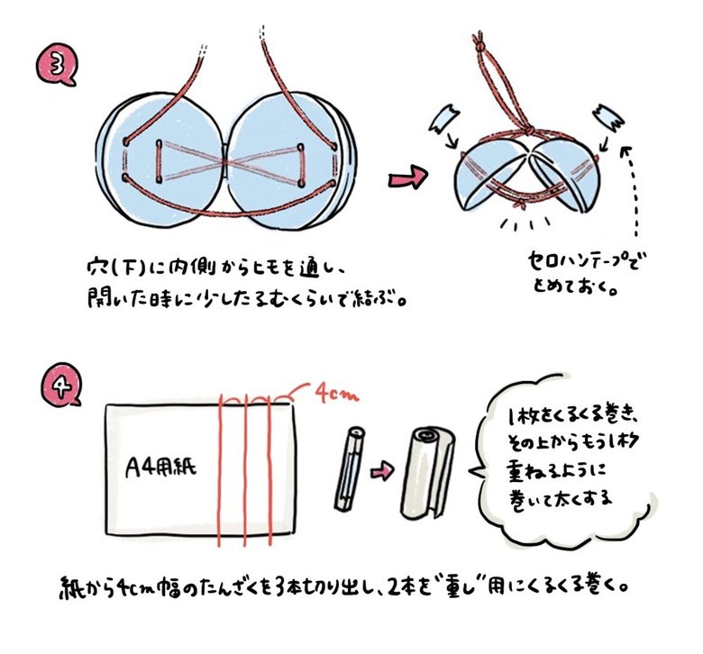 8では、カプセルを閉じるようにしながらひっぱる用のひもをテープで貼りましょう。