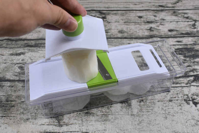 同商品は透明なケースとスライサーをつけ替えられるカバー、5つのスライサーと安全ホルダーで1つのセット。スライサーの種類は、フルーツ絞り、スライサー、太切り、細切り、おろし器の5種類となっています。最初は、オーソドックスなスライサーを使って実証開始。ケースにスライサーのアタッチメントを“カチッ”と取りつけ、準備完了です。