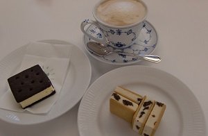 これはあとで知ったのですが、なんと「雪こんチーズ」も、マルセイアイスサンドと同じく、北海道の限られた店舗のみの販売だそうです。ココアビスケットに、分厚いチーズケーキがサンドされています。雪こんチーズは、出来てから2時間以内が食べごろ。時間がたつと、ビスケットのサクサク感が失われてしまうからだそうです。「こんなにレアでこだわっているスイーツ、もしかしてすごく高いんじゃないの?」なんて思っていませんか?なんとマルセイアイスサンドは200円、雪こんチーズは180円。超リーズナブル!ふだん、マルセイバターサンドを冷凍庫で凍らせて食べることもある私ですが、それとはまた一味違うように感じました。サンドされたアイスクリームの部分はさっぱり、ビスケットも軽めで、ほろほろと口のなかで溶けます。さすが、「瞬間を味わう」デザート。ビターなココアビスケットに濃厚で酸味の柔らかなチーズケーキも、なくなってしまうのが惜しくなるほど美味しかったです。こぶりなサイズなので、二人でシェアしてあっという間になくなりそう……と、その時!グラスの水をこぼしてしまいました。お皿にもすこしかかりましたが、マルセイアイスサンドはほとんど食べ終わっていたので、まあいいや、このまま食べちゃおうと手を伸ばしかけた時です。「お菓子が濡れてしまいませんでしたか? お取り替えいたします」と、店員さん。ただ、あと一口ほどだったので、それは断り、食べてしまいました。しかし、美味しかった、と余韻にひたっているとまたもや店員さんがいらして、「ビスケットのサクサク感を味わっていただきたいので、やはり新しいものをお持ちします」と、出来立てのマルセイアイスサンドを出してくださったのです!サクサク感へのこだわり、おそるべし!