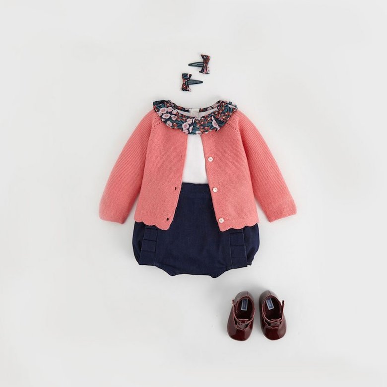 0~12か月(女の子) リバティへアピン¥2,000 リバティ襟付きボディ¥5,000 カーディガン¥9,000 デニムブルマー¥7,800